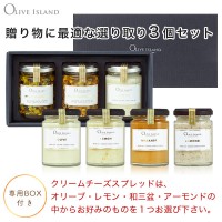 特産品・食品 > お菓子・スイーツ > 蜂蜜 > 調味料ギフト 3種 ギフトセット / BOX入り 【 限定ピスタチオオリーブオイル100g / 限定ナッツ&フルーツオリーブオイル100g / クリームチーズスプレッド110g(選り取り)合計3個 】コンフィ